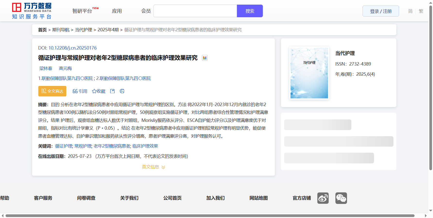目的 分析在老年2型糖尿病患者中应用循证护理与常规护理的区别。方法 将2022年1月-2023年12月内就诊的老年2型糖尿病患者100例以随机法分50例对照组常规护理,50例观察组实施循证护理,对比两组患者综合性管理情况和..