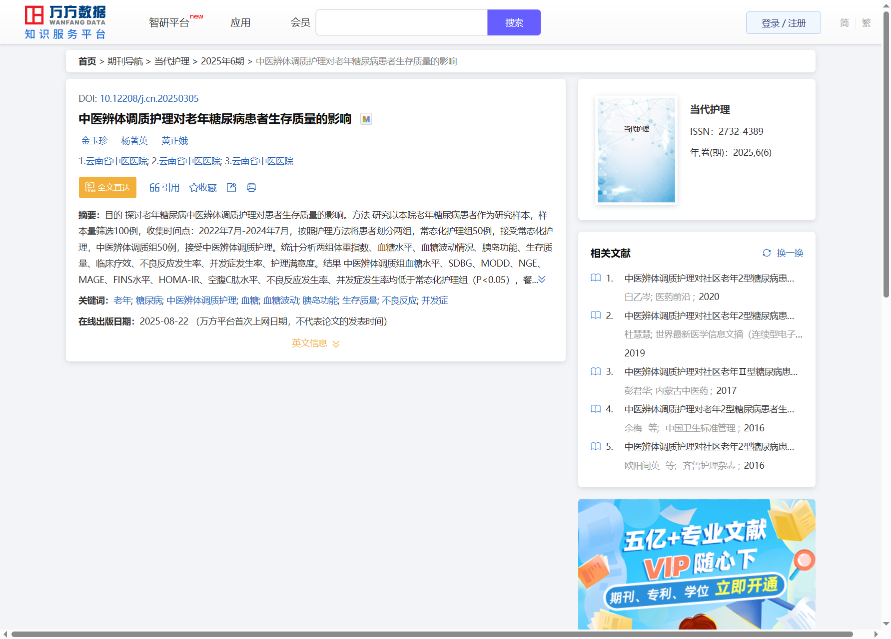 目的 探讨老年糖尿病中医辨体调质护理对患者生存质量的影响。方法 研究以本院老年糖尿病患者作为研究样本,样本量筛选100例,收集时间点:2022年7月-2024年7月,按照护理方法将患者划分两组,常态化护理组50例,接受..