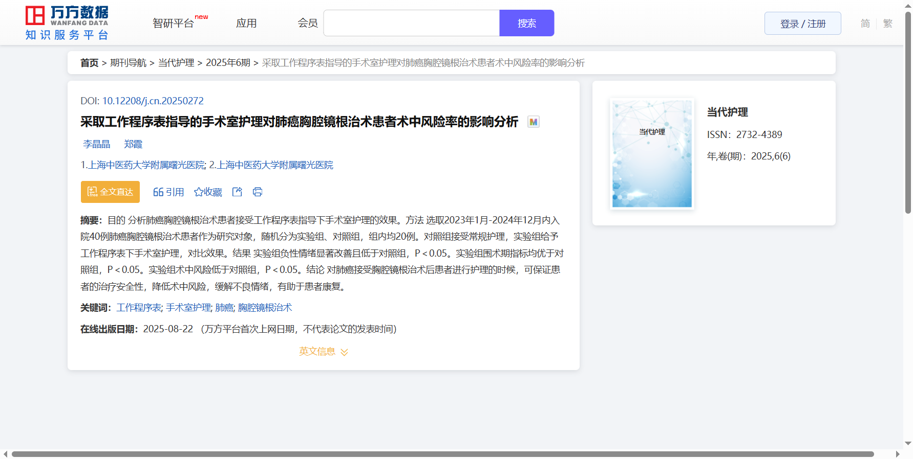 目的 分析肺癌胸腔镜根治术患者接受工作程序表指导下手术室护理的效果。方法 选取2023年1月-2024年12月内入院40例肺癌胸腔镜根治术患者作为研究对象,随机分为实验组、对照组,组内均20例。对照组接受常规护理,实验..