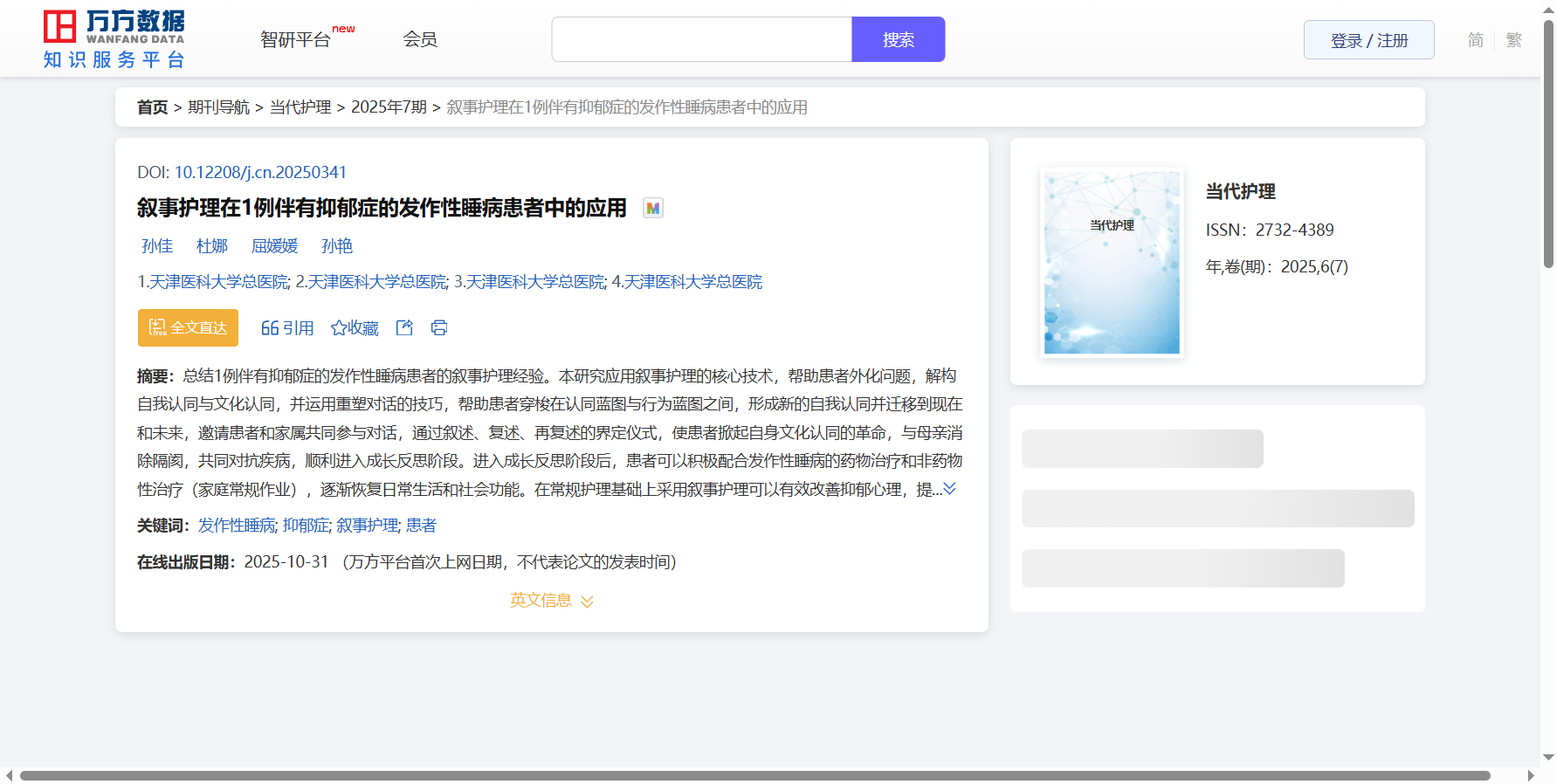总结1例伴有抑郁症的发作性睡病患者的叙事护理经验。本研究应用叙事护理的核心技术,帮助患者外化问题,解构自我认同与文化认同,并运用重塑对话的技巧,帮助患者穿梭在认同蓝图与行为蓝图之间,形成新的自我认同并..