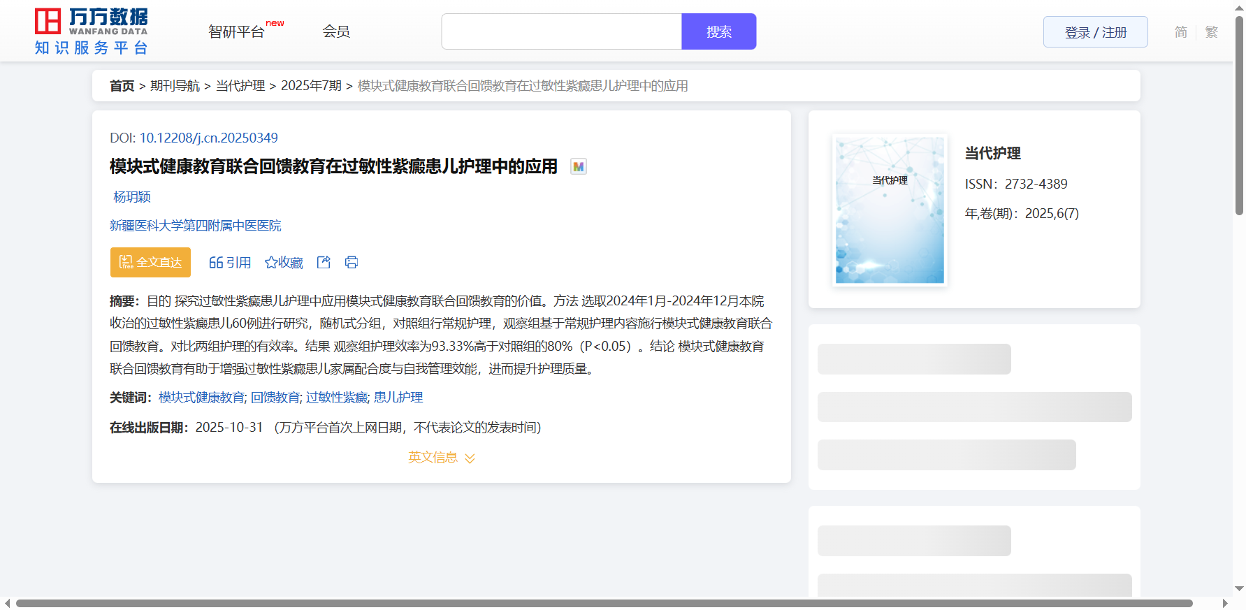 目的 探究过敏性紫癜患儿护理中应用模块式健康教育联合回馈教育的价值。方法 选取2024年1月-2024年12月本院收治的过敏性紫癜患儿60例进行研究,随机式分组,对照组行常规护理,观察组基于常规护理内容施行模块式健康..