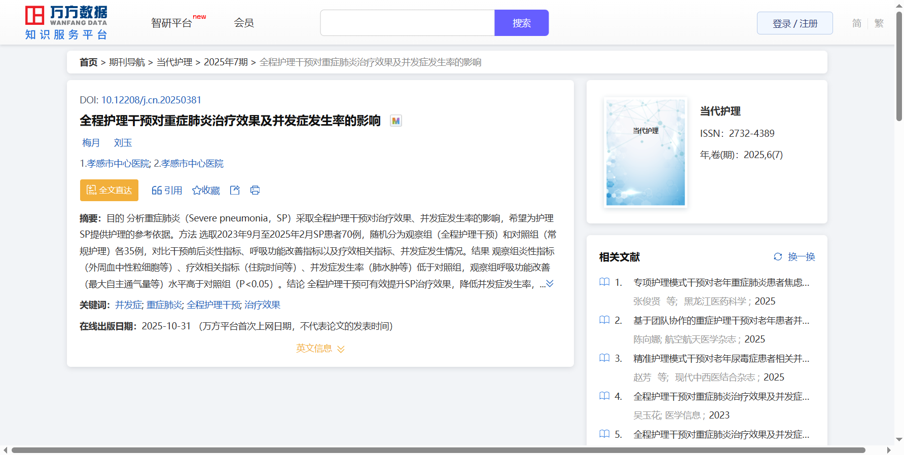 目的 分析重症肺炎(Severe pneumonia,SP)采取全程护理干预对治疗效果、并发症发生率的影响,希望为护理SP提供护理的参考依据。方法 选取2023年9月至2025年2月SP患者70例,随机分为观察组(全程护理干预)和对照组..