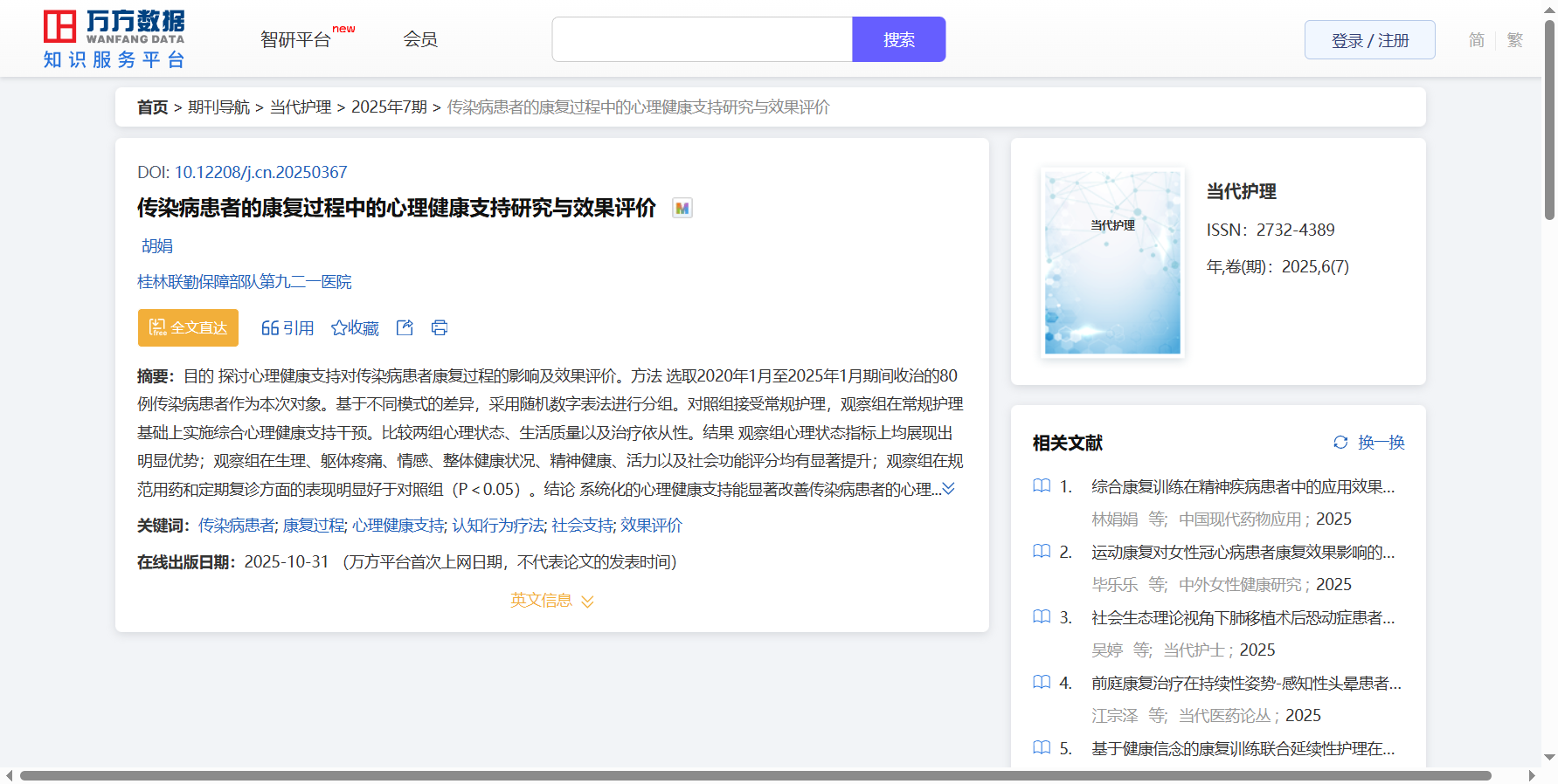 目的 探讨心理健康支持对传染病患者康复过程的影响及效果评价。方法 选取2020年1月至2025年1月期间收治的80例传染病患者作为本次对象。基于不同模式的差异,采用随机数字表法进行分组。对照组接受常规护理,观察组在..