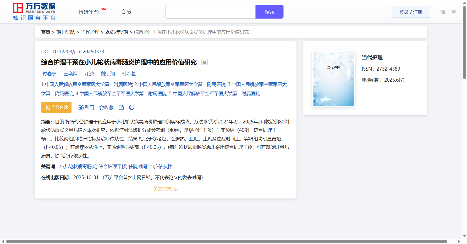 目的 探析综合护理干预应用于小儿轮状病毒肠炎护理中的实际成效。方法 将我院2024年2月-2025年2月收治的80例轮状病毒肠炎患儿纳入本次研究,依据信封法随机分成参考组(40例,常规护理干预)与实验组(40例,综合护..