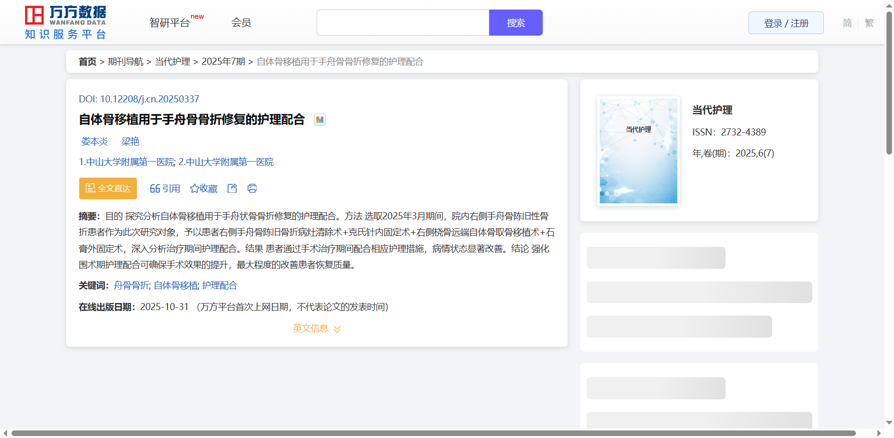 目的 探究分析自体骨移植用于手舟状骨骨折修复的护理配合。方法 选取2025年3月期间,院内右侧手舟骨陈旧性骨折患者作为此次研究对象,予以患者右侧手舟骨陈旧骨折病灶清除术+克氏针内固定术+右侧桡骨远端自体骨取骨..