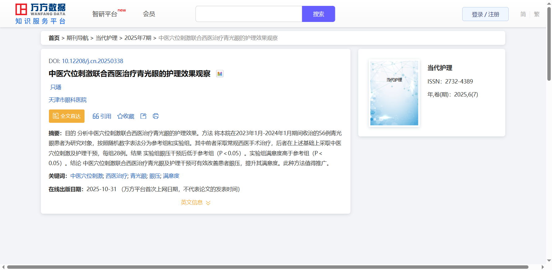 目的 分析中医穴位刺激联合西医治疗青光眼的护理效果。方法 将本院在2023年1月-2024年1月期间收治的56例青光眼患者为研究对象,按照随机数字表法分为参考组和实验组。其中前者采取常规西医手术治疗,后者在上述基础..