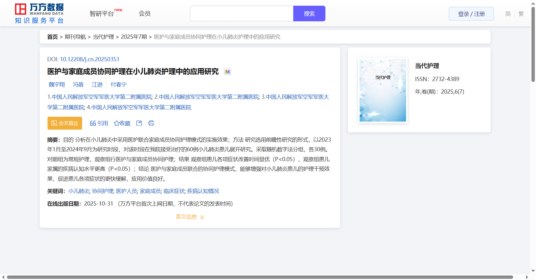 目的 分析在小儿肺炎中采用医护联合家庭成员协同护理模式的实施效果;方法 研究选用前瞻性研究的形式,以2023年1月至2024年9月为研究时段,对该时段在我院接受治疗的60例小儿肺炎患儿展开研究。采取随机数字法分组,..